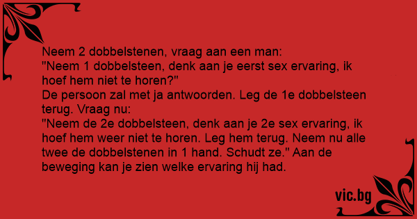 "Neem de 2e dobbelsteen, denk aan je 2e sеx ervaring, ik hoef hem weer niet te horen. Leg hem terug. Neem nu alle twee de dobbelstenen in 1 hand. Schudt ze." Aan de beweging kan je zien welke ervaring hij had.