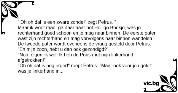 Maar ik weet raad: ga daar naar het Heilige Beekje, was je rechterhand goed schoon en je mag naar binnen. De eerste pater wast zijn rechterhand en mag vervolgens naar binnen wandelen. De tweede pater wordt eveneens de vraag gesteld door Petrus: