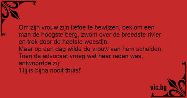 Om zijn vrouw zijn liefde te bewijzen, beklom een man de hoogste berg, zwom over de breedste rivier en trok door de heetste woestijn.