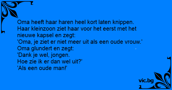 'Oma, je ziet er niet meer uit als een oude vrouw.' Oma glundert en zegt: