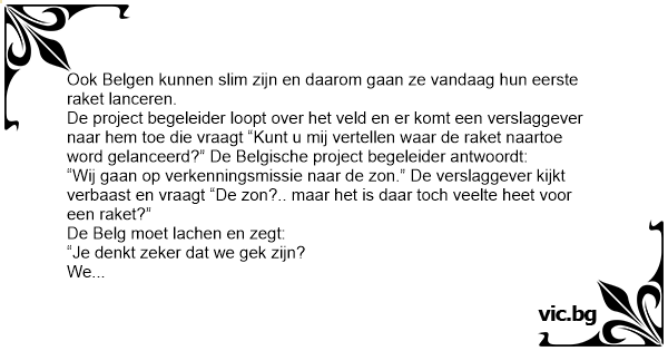 De project begeleider loopt over het veld en er komt een verslaggever naar hem toe die vraagt “Кunт u mij vertellen waar de raket naartoe word gelanceerd?” De Belgische project begeleider antwoordt: