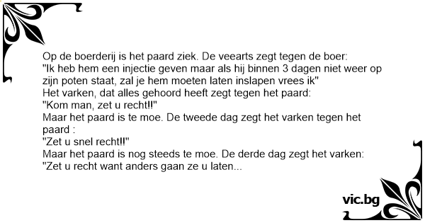 Het paard raapt al zijn krachten samen en zet zich recht. De boer is uitermate tevreden en zegt: