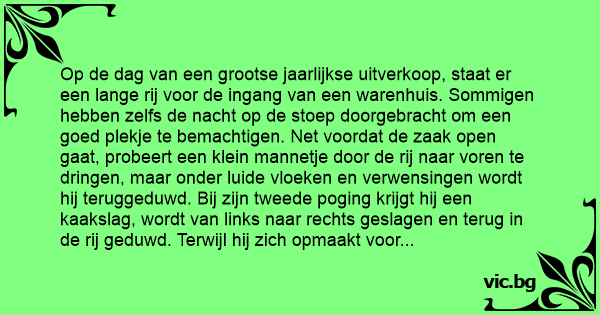 Op de dag van een grootse jaarlijkse uitverkoop, staat er een lange rij voor de ingang van een warenhuis. Sommigen hebben zelfs de nacht op de stoep doorgebracht om een goed plekje te bemachtigen. Net voordat de zaak open gaat, probeert een klein mannetje door de rij naar voren te dringen, maar onder luide vloeken en verwensingen wordt hij teruggeduwd. Bij zijn tweede poging krijgt hij een kaakslag, wordt van links naar rechts geslagen en terug in de rij geduwd. Terwijl hij zich opmaakt voor een derde poging zegt hij tegen de man die voor hem staat: Als ze me nog een keer slaan, gaat de winkel niet open!