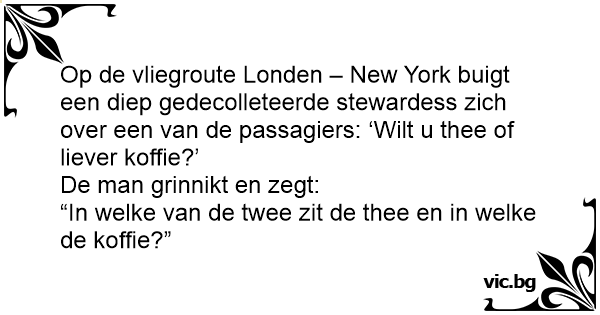 Op de vliegroute Londen – New York buigt een diep gedecolleteerde stewardess zich over een van de passagiers: ‘Wilt u thee of liever koffie?’