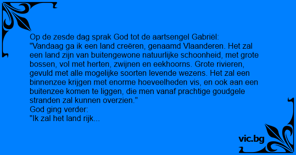 "Vandaag ga ik een land creëren, genaamd Vlaanderen. Het zal een land zijn van buitengewone natuurlijke schoonheid, met grote bossen, vol met herten, zwijnen en eekhoorns. Grote rivieren, gevuld met alle mogelijke soorten levende wezens. Het zal een binnenzee krijgen met enorme hoeveelheden vis, en ook aan een buitenzee komen te liggen, die men vanaf prachtige goudgele stranden zal kunnen overzien."