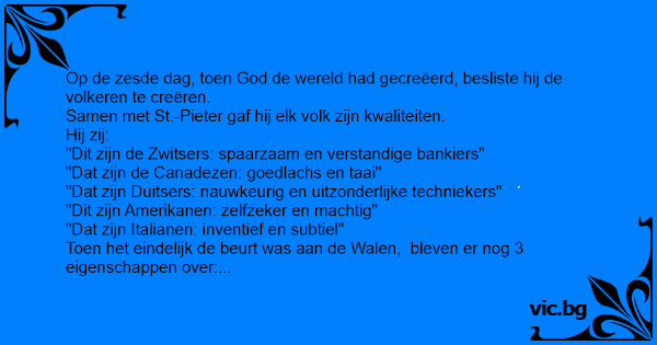 "Nee," zegt God, "Ik leg het je uit. De Walen willen altijd meer dan de anderen, daarom krijgen zij 3 kwaliteiten... maar ze zullen er maar twee tegelijk kunnen gebruiken!"