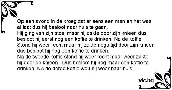 Na de tweede koffie stond hij weer recht maar weer zakte hij door de knieën . Dus besloot hij nog maar een koffie te drinken. NA de derde koffie wou hij weer naar huis gaan maar weer zakte hij door de knieën . Dus besloot hij op zijn knieën naar huis te gaan . Toen hij thuis kwam lag zijn vrouw al lang te slapen . Dus hij dacht ; ze zal morgen niet weten dat ik weer eens in de kroeg ben geweest.