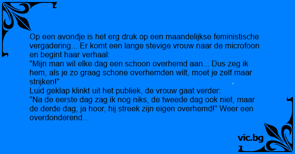 "Na de eerste dag zag ik nog niks, de tweede dag ook niet, maar de derde dag, ja hооr, hij streek zijn eigen overhemd!" Weer een overdonderend geklap uit het publiek...