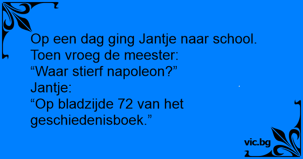 Jantje zat op een dag in de klas toen de leraar ineens vroeg: “Waar stierf napoleon?” Waarop Jantje antwoordt: “Op bladzijde 45 van het geschiedenisboek”