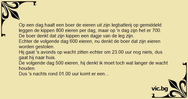 Op een dag haalt een boer de eieren uit zijn legbatterij op gemiddeld leggen de kippen 800 eieren per dag, maar op 'n dag zijn het er 700.