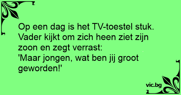 Op een dag is het TV-toestel stuk. Vader kijkt om zich heen ziet zijn zoon en zegt verrast: 'Maar jongen, wat ben jij groot geworden!'