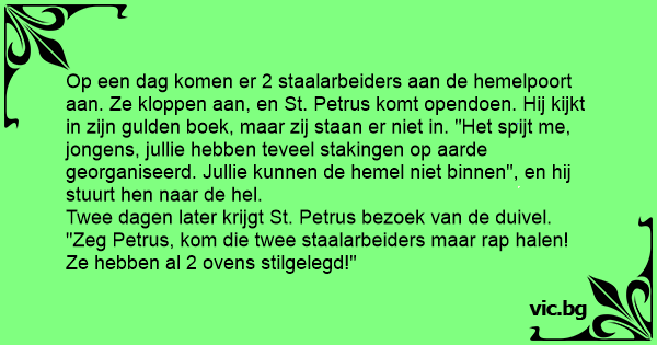 Twee dagen later krijgt St. Petrus bezoek van de duivel. "Zeg Petrus, kom die twee staalarbeiders maar rap halen! Ze hebben al 2 ovens stilgelegd!"