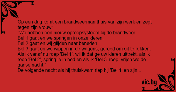 Op een dag komt een brandweerman thuis van zijn werk en zegt tegen zijn vrouw: