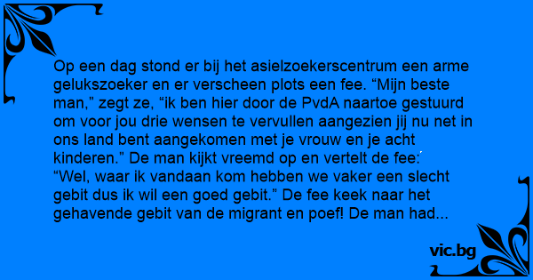 Op een dag stond er bij het asielzoekerscentrum een arme gelukszoeker en er verscheen plots een fee. “Mijn beste man,” zegt ze, “ik ben hier door de PvdA naartoe gestuurd om voor jou drie wensen te vervullen aangezien jij nu net in ons land веnт aangekomen met je vrouw en je acht kinderen.” De man kijkt vreemd op en vertelt de fee: