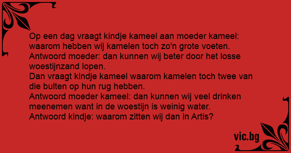 Op een dag vraagt kindje kameel aan moeder kameel: waarom hebben wij kamelen toch zo'n grote voeten. Antwoord moeder: dan kunnen wij beter door het losse woestijnzand lopen. Dan vraagt kindje kameel waarom kamelen toch twee van die bulten op hun rug hebben. Antwoord moeder kameel: dan kunnen wij veel drinken meenemen want in de woestijn is weinig water. Antwoord kindje: waarom zitten wij dan in Artis?
