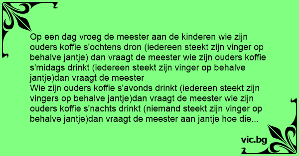 Op een dag vroeg de meester aan de kinderen wie zijn ouders koffie s'ochtens dron (iedereen steekt zijn vinger op behalve jantje) dan vraagt de meester wie zijn ouders koffie s'midags drinkt (iedereen steekt zijn vinger op behalve jantje)dan vraagt de meester