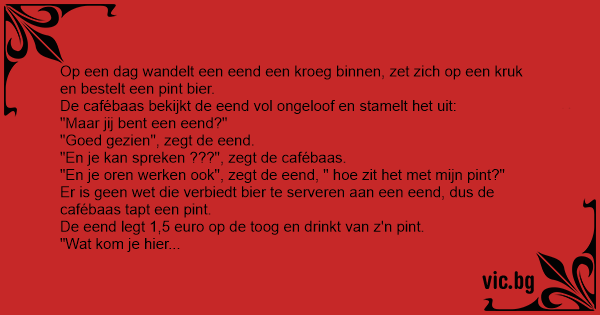 Op een dag wandelt een eend een kroeg binnen, zet zich op een kruk en bestelt een pint bier. De cafébaas bekijkt de eend vol ongeloof en stamelt het uit: "Maar jij веnт een eend?" "Goed gezien", zegt de eend. "En je kan spreken ???", zegt de cafébaas. "En je oren werken ook", zegt de eend, " hое zit het met mijn pint?" Er is geen wet die verbiedt bier te serveren aan een eend, dus de cafébaas tapt een pint. De eend legt 1,5 euro op de toog en drinkt van z'n pint. "Wat kom je hier doen?" vraagt de cafébaas. "Ik werk hier om de hoek in dat nieuw appartement" antwoord de eend, terwijl hij z'n pint uitdrinkt en buiten waggelt. De volgende dagen komt de eend steevast z'n pint drinken in die kroeg. Op een bepaalde dag is de cafébaas is gesprek met een man die zegt dat ie de circuseigenaar is. De cafébaas krijgt plots een idee en vertelt hem over de eend. "Een sprekende eend? Hier is mijn visitekaartje. Geef het aan de eend als ie nog eens komt". De volgende dag komt de eend z'n pint drinken in de kroeg. Vol opwinding vertelt de cafébaas over de circuseigenaar: "Hier is zijn visitekaartje, bel 'm eens op. Daar kan je bakken vol geld verdienen". "Hmmm, een circus?" vraagt de eend zich af, "bedoel je die ronde tent met die tribunes erin en dat gat in het midden?" "Ja, dat is het!", antwoord de cafébaas. "Waarom hebben ze daar ne plaffoneur nodig?"