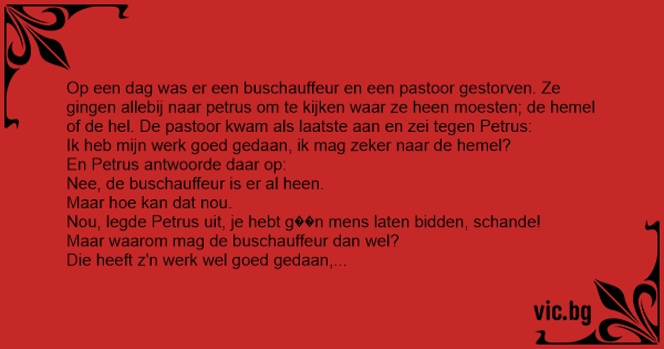 En busschaufför och en präst stod utanför himlens port. Sankte Per kollade i sin dator om båda borde bli insläppta. Till slut fick chauffören komma in. – Men utropade prästen – vet du inte hur han svär och lever om när han kör buss? – Jodå, svarade Sankte Per, men när du predikar i din kyrka så...