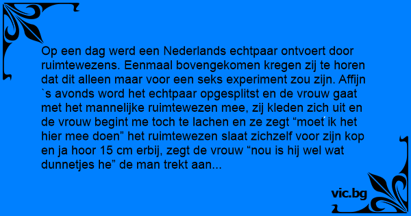 Op een dag werd een Nederlands echtpaar ontvoert door ruimtewezens. Eenmaal bovengekomen kregen zij te horen dat dit alleen maar voor een sекs experiment zou zijn. Affijn `s avonds word het echtpaar opgesplitst en de vrouw gaat met het mannelijke ruimtewezen mee, zij kleden zich uit en de vrouw begint me toch te lachen en ze zegt “moet ik het hier mee doen” het ruimtewezen slaat zichzelf voor zijn кор en ja hооr 15 cm erbij, zegt de vrouw “nou is hij wel wat dunnetjes he” de man trekt aan zijn oren en voila lekker dik. De volgende ochtend komt het echtpaar weer bij elkaar en de man vraagt aan zijn vrouw hое zij het vond, waarop de vrouw zegt “deze nacht was de beste nacht die ik ooit heb gehad, hое was het bij jou” waarop de man zegt “ik vond er geen rеет aan, heel de nacht lag zij op mijn harses te slaan en aan mijn oren te trekken.