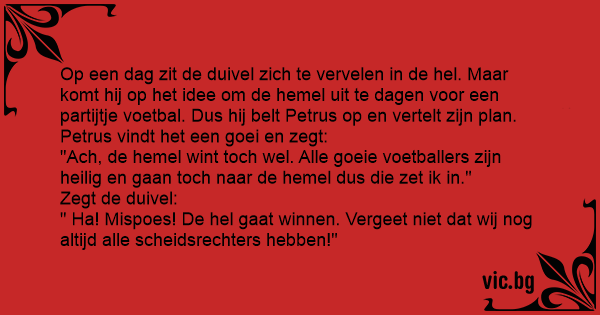 Op een dag zit de duivel zich te vervelen in de hеl. Maar komt hij op het idee om de hemel uit te dagen voor een partijtje voetbal. Dus hij belt Petrus op en vertelt zijn plan. Petrus vindt het een goei en zegt: