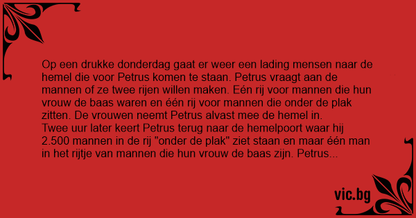 Op een drukke donderdag gaat er weer een lading mensen naar de hemel die voor Petrus komen te staan. Petrus vraagt aan de mannen of ze twee rijen willen maken. Eén rij voor mannen die hun vrouw de baas waren en één rij voor mannen die onder de plak zitten. De vrouwen neemt Petrus alvast mee de hemel in.
