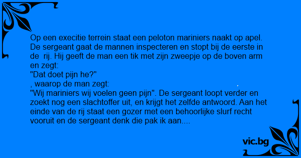 "Wij mariniers wij voelen geen pijn". De sergeant loopt verder en zoekt nog een slachtoffer uit, en krijgt het zelfde antwoord. Aan het einde van de rij staat een gozer met een behoorlijke slurf recht vooruit en de sergeant denk die pak ik aan. Hij geeft de man een tik met het zweepje op zijn slurf en zegt weer, "dat doet pijn he?" waarop de man zegt, " Geen idee, hij is van die vent achter me"
