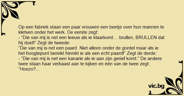 - ”Die van mij is net een leeuw als ie klaarkomt… brullen, BRULLEN dat hij doet!” Zegt de tweede: