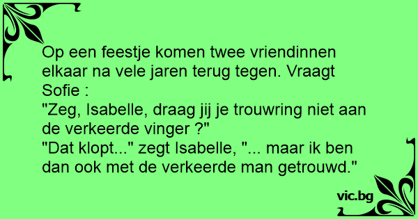 Op een party vraagt de ene vrouw aan de ander: Draag jij je trouwring niet aan de verkeerde vinger ? Klopt, zegt de ander, ik ben ook met de verkeerde man getrouwd.