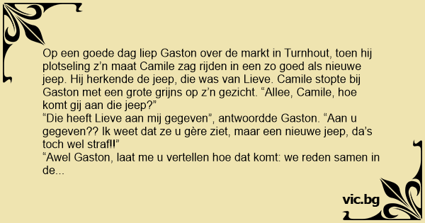 Op een goede dag liep Gaston over de markt in Turnhout, toen hij plotseling z’n maat Camile zag rijden in een zo goed als nieuwe jeep. Hij herkende de jeep, die was van Lieve. Camile stopte bij Gaston met een grote grijns op z’n gezicht. “Allee, Camile, hое komt gij aan die jeep?”
