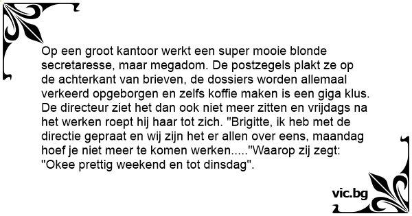 Op een groot kantoor werkt een super mooie blonde secretaresse, maar megadom. De postzegels plakt ze op de achterkant van brieven, de dossiers worden allemaal verkeerd opgeborgen en zelfs koffie maken is een giga klus. De directeur ziet het dan ook niet meer zitten en vrijdags na het werken roept hij haar tot zich. "Brigitte, ik heb met de directie gepraat en wij zijn het er allen over eens, maandag hoef je niet meer te komen werken....."Waarop zij zegt: