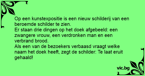 Als een van de bezoekers verbaasd vraagt welke naam het doek heeft, zegt de schilder: Te laat eruit gehaald!