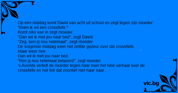 's Avonds vertelt de moeder tegen haar man het hele verhaal over de crossfiets en het feit dat zoonlief met haar naar bed wil. "Tja," zegt vader, "die crossfiets kunnen wij niet betalen, maar om van het hele gezeur af te zijn ga je toch met hem naar bed. Zo 'n jongetje van acht kan toch nog niks vernielen op seksueel gebied. "