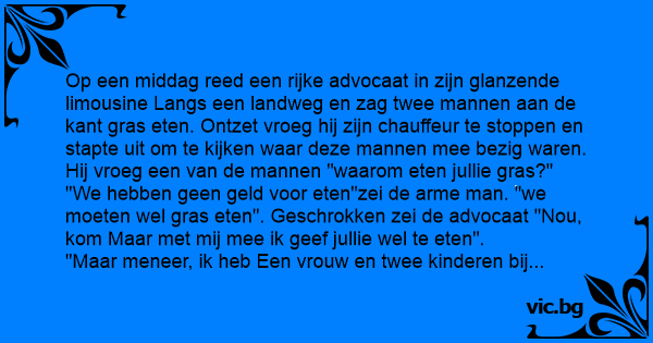 "We hebben geen geld voor eten"zei de arme man. "we moeten wel gras eten". Geschrokken zei de advocaat "Nou, kom Maar met mij mee ik geef jullie wel te eten".