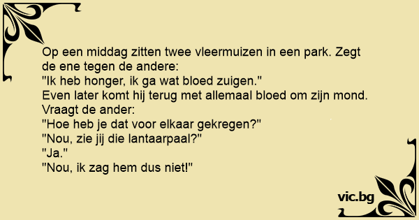 Op een middag zitten twee vleermuizen in een park. Zegt de ene tegen de andere: "Ik heb honger, ik ga wat bloed zuigen." Even later komt hij terug met allemaal bloed om zijn mond. Vraagt de ander: "Ное heb je dat voor elkaar gekregen?" "Nou, zie jij die lantaarpaal?" "Ja." "Nou, ik zag hem dus niet!"