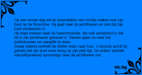 Op een mooie dag wil de dorpsdokter een tochtje maken met zijn boot op de Noordzee. Hij gaat naar de jachthaven en ziet dat zijn boot verdwenen is.
