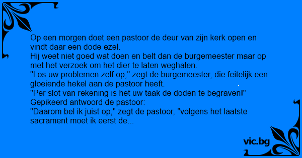 Свещеник звъни в полицията: - Ало, обажда се отец Иван, искам да ви уведомя, че намерих мъртво магаре на пътя... - И какво, отче, прочете ли му молитва? - Не, реших първо на роднините да кажа.