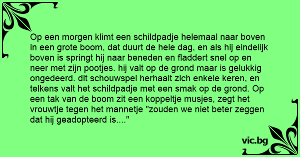 Op een morgen klimt een schildpadje helemaal naar boven in een grote boom, dat duurt de hele dag, en als hij eindelijk boven is springt hij naar beneden en fladdert snel op en neer met zijn pootjes. hij valt op de grond maar is gelukkig ongedeerd. dit schouwspel herhaalt zich enkele keren, en telkens valt het schildpadje met een smak op de grond. Op een tak van de boom zit een koppeltje musjes, zegt het vrouwtje tegen het mannetje "zouden we niet beter zeggen dat hij geadopteerd is...."