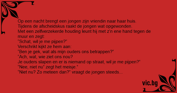 Το αγόρι γυρίζει την κοπελιά του στο σπίτι πριν (ως συνήθως) τα μεσάνυχτα. Όταν φτάνουν στην εξώπορτα, ακουμπάει το χέρι στον τοίχο και της λεει, -«γλυκιά μου κάνε μου μια πίπα» -«τι? είσαι...