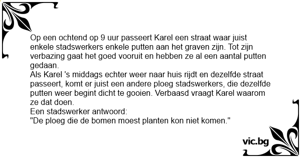 Op een ochtend op 9 uur passeert Karel een straat waar juist enkele stadswerkers enkele putten aan het graven zijn. Tot zijn verbazing gaat het goed vooruit en hebben ze al een aantal putten gedaan.
