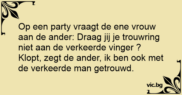 Op een party vraagt de ene vrouw aan de ander: Draag jij je trouwring niet aan de verkeerde vinger ? Klopt, zegt de ander, ik ben ook met de verkeerde man getrouwd.