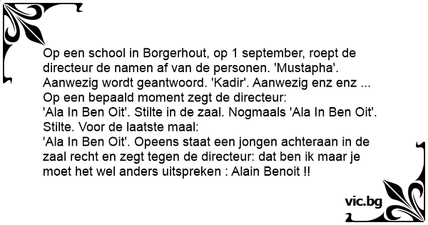 'Ala In Ben Oit'. Opeens staat een jongen achteraan in de zaal recht en zegt tegen de directeur: dat ben ik maar je moet het wel anders uitspreken : Alain Benoit !!
