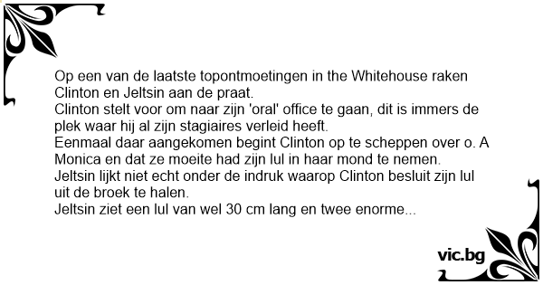 Eenmaal daar aangekomen begint Clinton op te scheppen over o. A Monica en dat ze moeite had zijn lul in haar mond te nemen.