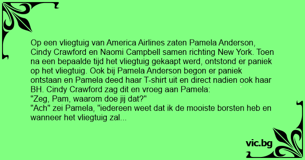 "Ach" zei Pamela, "iedereen weet dat ik de mooiste borsten heb en wanneer het vliegtuig zal crashen zullen ze mijn mooie borsten zien en zullen ze mij dan ook het eerst redden!"