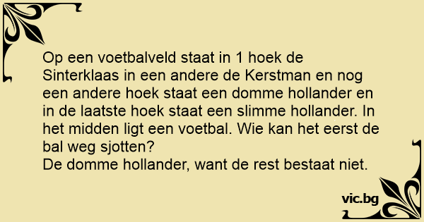 Op een voetbalveld staat in 1 hoek de Sinterklaas in een andere de Kerstman en nog een andere hoek staat een domme hollander en in de laatste hoek staat een slimme hollander. In het midden ligt een voetbal. Wie kan het eerst de bal weg sjotten?