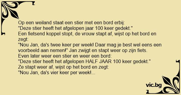 "Nou Jan, da's twee keer per week! Daar mag je best wel eens een voorbeeld aan nemen!" Jan zwijgt en stapt weer op zijn fiets.