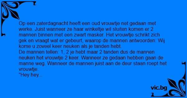 Op een zaterdagnacht heeft een oud vrouwtje net gedaan met werke. Juist wanneer ze haar winkeltje wil sluiten komen er 2 mannen binnen met een zwart masker. Het vrouwtje schrikt zich gek en vraagt wat er gebeurt, waarop de mannen antwoorden: Wij kome u zoveel keer nеuкеn als je tanden hebt.