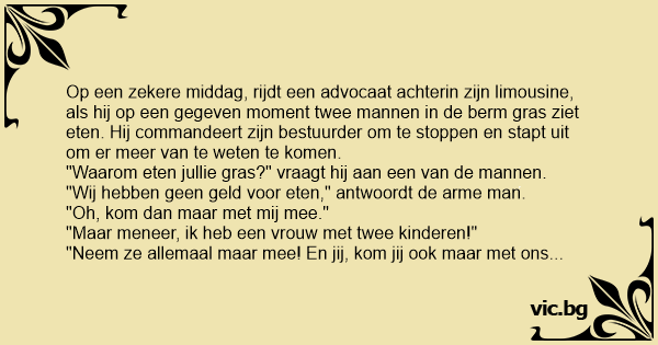 "Maar meneer, ik heb een vrouw met zes kinderen!" antwoordt de tweede man.