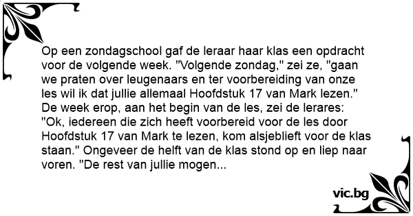 Op een zondagschool gaf de leraar haar klas een opdracht voor de volgende week. "Volgende zondag," zei ze, "gaan we praten over leugenaars en ter voorbereiding van onze les wil ik dat jullie allemaal Hoofdstuk 17 van Mark lezen." De week erop, aan het begin van de les, zei de lerares: