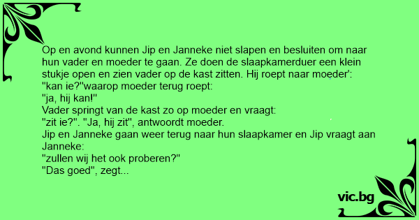 Op en avond kunnen Jip en Janneke niet slapen en besluiten om naar hun vader en moeder te gaan. Ze doen de slaapkamerduer een klein stukje open en zien vader op de kast zitten. Hij roept naar moeder':