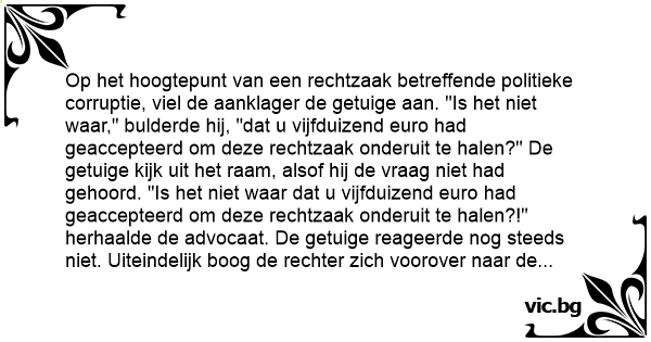 Op het hoogtepunt van een rechtzaak betreffende politieke corruptie, viel de aanklager de getuige aan. "Is het niet waar," bulderde hij, "dat u vijfduizend euro had geaccepteerd om deze rechtzaak onderuit te halen?" De getuige kijk uit het raam, alsof hij de vraag niet had gehoord. "Is het niet waar dat u vijfduizend euro had geaccepteerd om deze rechtzaak onderuit te halen?!" herhaalde de advocaat. De getuige reageerde nog steeds niet. Uiteindelijk boog de rechter zich voorover naar de getuige en zei: